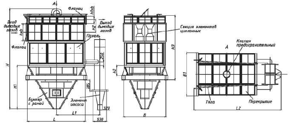 Батарейные циклоны БЦ-245-1-(7x8) — это ряд полых цилиндрических корпусов с конусообразной нижней частью, входными патрубками и аппаратами закручивания (полуулитками). Внутри общего корпуса батарейного циклона расположен ряд циклонных элементов, где каждый последующий устанавливается ниже предыдущего.